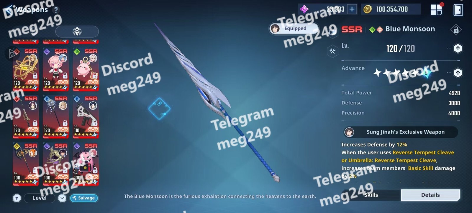 • Blue Monsoon (Sung Jinah Exclusive Spear) — Lv120 +5, Power 4,928, DEF 3,080, Precision 4,000