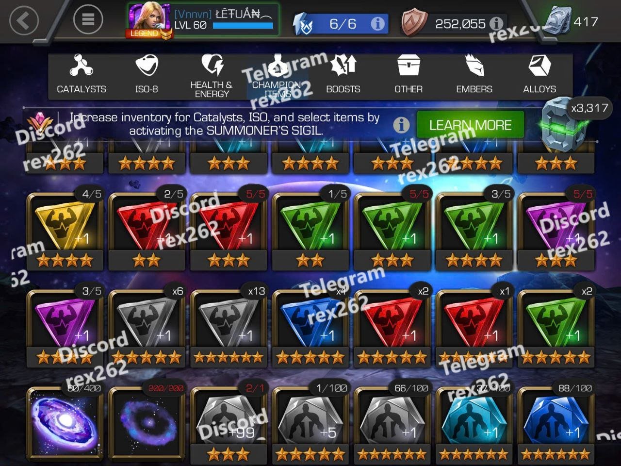 – Catalysts: Fully stocked Tier 5 and Tier 6 catalysts across all classes (Mystic, Cosmic, Tech, Mutant). Maxed inventory for ISO-8, catalysts, and sig stones.