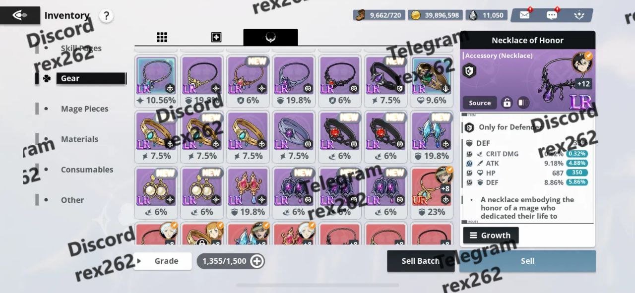 Gear: Complete set of SSR and LR gear, upgraded to max, including Necklace of Honor and other high-DEF/ATK items
