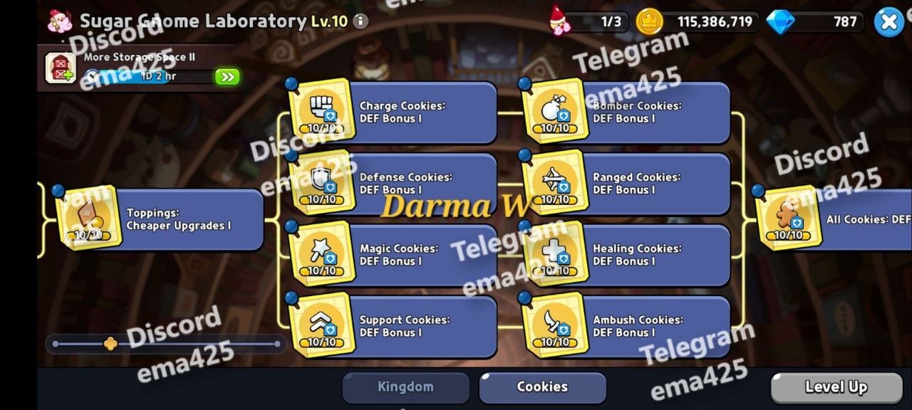 Laboratory Lv 10: Fully upgraded Sugar Gnome Lab with research completed on key cookie types: Charge, Magic, Bomber, Ranged, and more for increased power and versatility in combat.