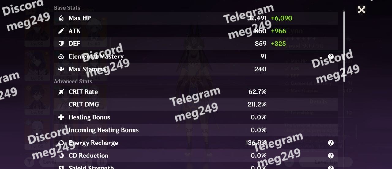 • Ayaka: CR 54.5% | CD 286.2% | ATK 884+1371 • Cyno: CR 62.7% | CD 211.2% | ATK 860+966 | ER 136.9% • Neuvillette: CR 52.4% | CD 200.3% | HP 14,695+14,104 • Hu Tao: CR 47.8% | CD 219.8% | HP 15,552+16,781 • Raiden Shogun: CR 48.3% | CD 231.6% | ER 111% • Yelan: CR 27.2% | CD 71% | ER 190% • Yae Miko: CR 51.4% | CD 164.3% | ATK 648+813 • Kuki Shinobu: EM 808 | ER 111%