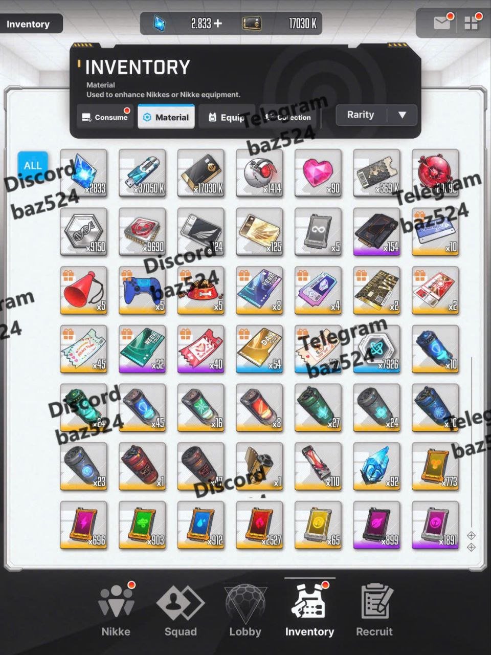 Inventory: Includes high-level gear, upgrade materials, and consumables.