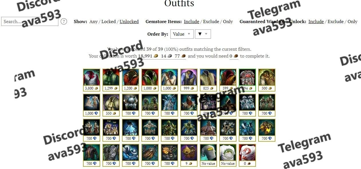 1500 material storage capacity -100K+ gold worth in wardrobe skins and minis (was a personal project of mine to having every skin worth up to 40g to make the wardrobe unlock vouchers worthwhile) -All dyes (including permafrost)