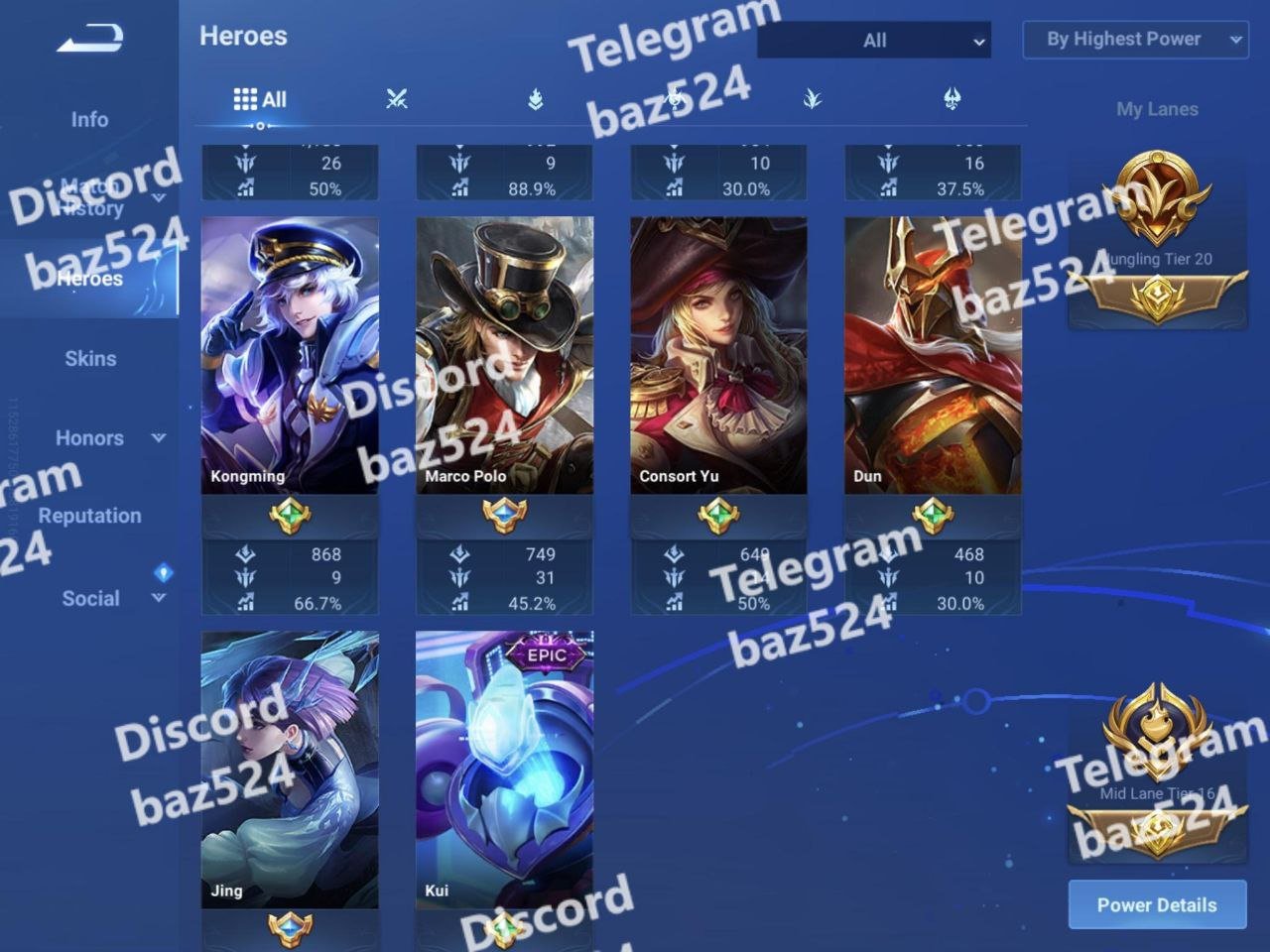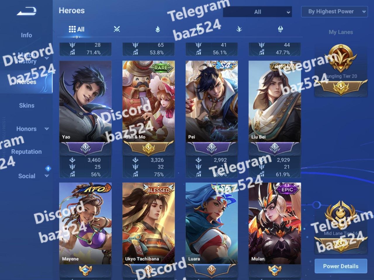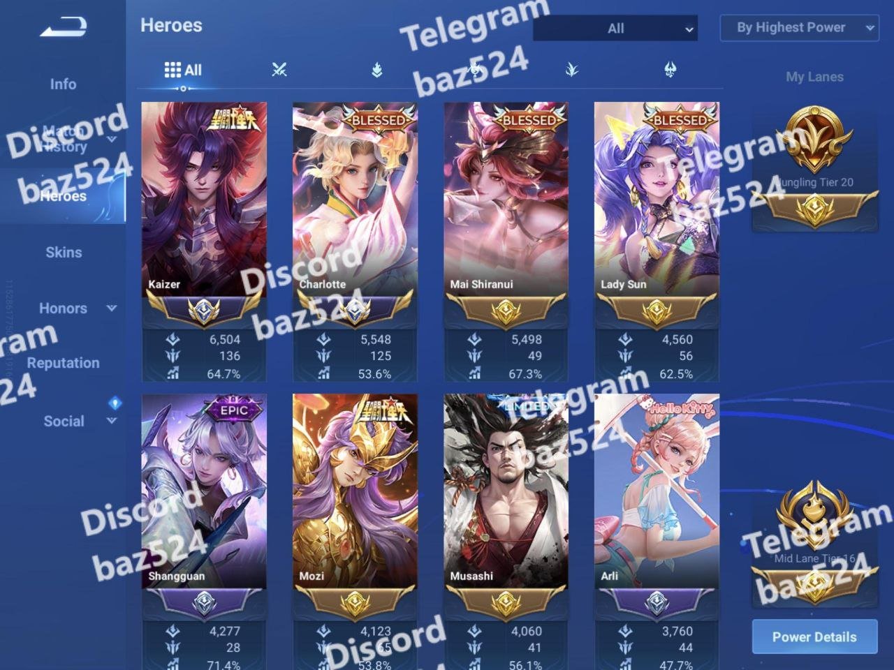 Home 1 baz 524 Honor of kings | Global | Lv128 | Master III (S7) | 93 Heroes | 137 Skins | Kaizer (Hades), 4 Blessed | 2 Hello Kitty | 2 Limited | 1164 Matches | 1146 Hero’s Gorge Points