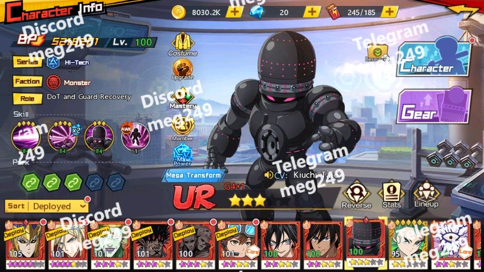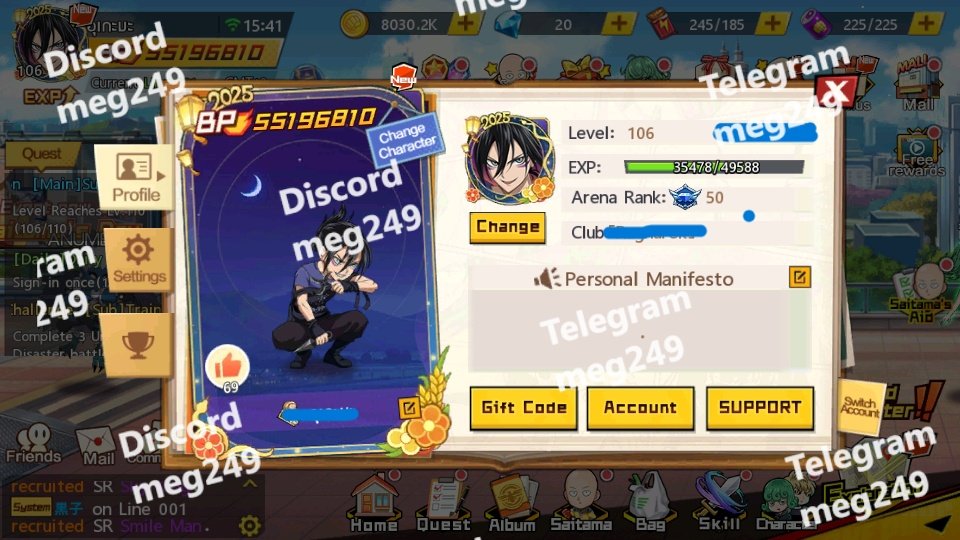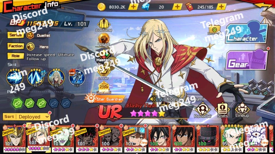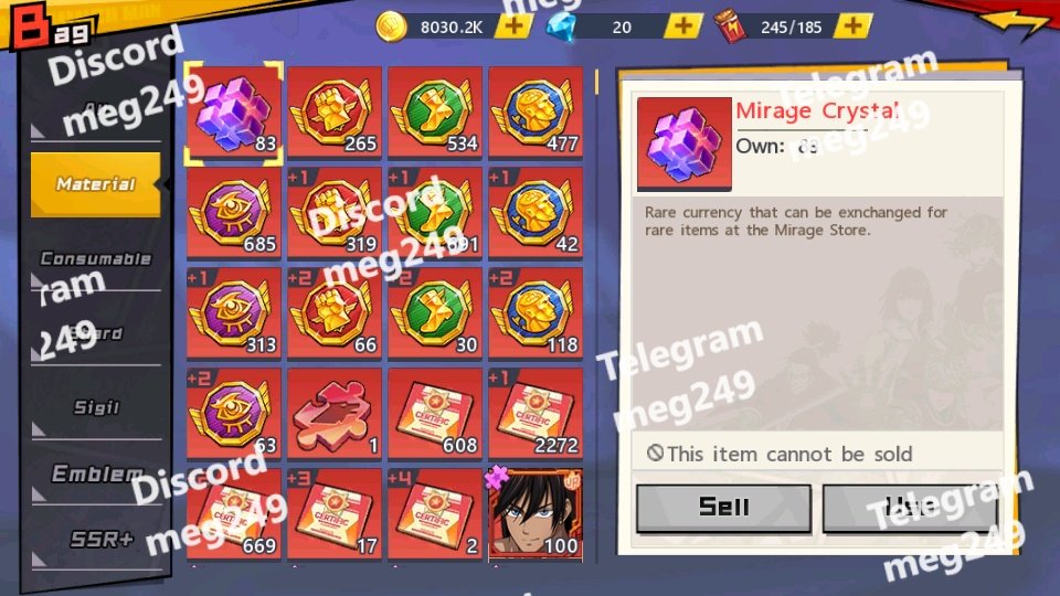 Inventory Highlights Mirage Crystals: 83 EXP Bottles: 9,999+ large + 7,498 medium Voucher Lucky Bag: 2 Training Certificates: 2,272+ Various Enhancer & Awakening shards (Crit, Defense, Skill etc.) SSR+ Awakening Stones for Suiryu, Gouketsu, Flashy Flash, Bang, Garou, etc.